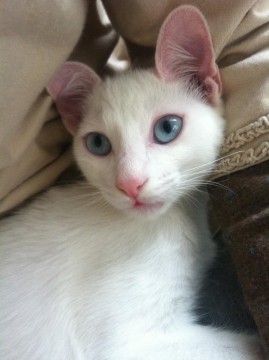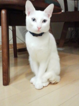 青い目の真っ白い猫です。カギしっぽ(尻尾の先が曲がっている)で