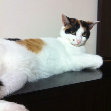 白の多い三毛猫。ちょっとおデブです。避妊済み。