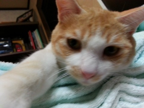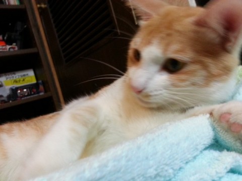 のんびり、甘えん坊。最近、近所のノラと喧嘩してシッポを怪我しています。獣医さんに手当してもらった時に毛をかられシッポのど真ん中にハゲがあります。