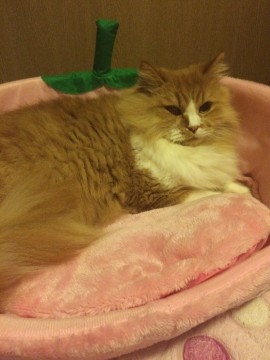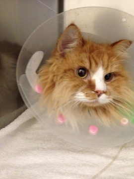 立ち耳のスコティッシュフォールト、虎色。手術したばっかり、お腹に手術跡があります。