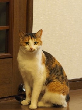 雑種で色は白茶黒の三毛猫の女の子で避妊手術済み。