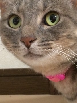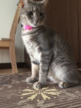 毛色はグレーでノミダニ予防の首輪?をしてます。
