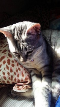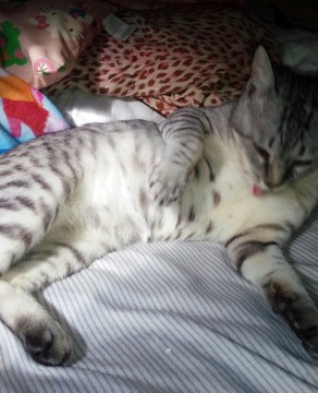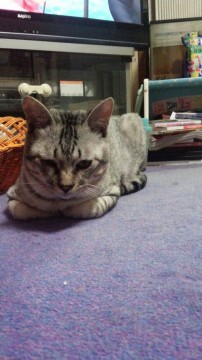 今は赤ベースの布製でマジックテープでとめる首輪に、黒い鈴がついています。お腹が白と黒のトラとかシマウマのような模様で、目の横からほっぺ上くらいまでアイラインを引いたような模様と、頭の上によく見るとリボンのような模様があります。しっぽの先は黒で肉球は焦げ茶です。アメショーのmixで茶色と灰色っぽい色と黒ラインです。名前を呼ぶと返事をします。