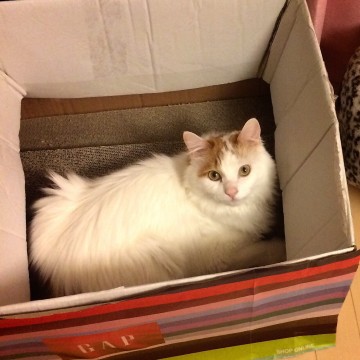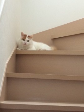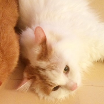 毛足が長い白猫で頭と尻尾が茶色いです。首輪はしていません。