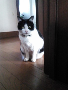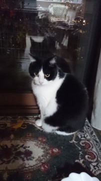 白黒トムキャット短尾カギ尻尾、ぽっちゃり。5キロ。びびり。行動範囲狭い。背中にアレルギー湿疹による脱毛あり。