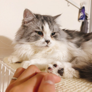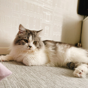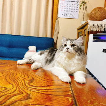 長毛で立ち耳のスコティッシュフォールドです。身体がアッシュ系の色で足元が白色です。