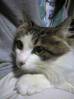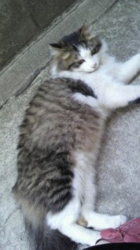 白地にトラ模様、長毛のオス(去勢済み)、生後6ヶ月程ですが、見た目は成猫と大差ないです。(4kg程)