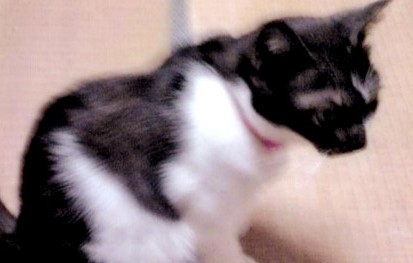 白と黒が混じった色で鈴のついたピンクの首輪をしています。小柄です。