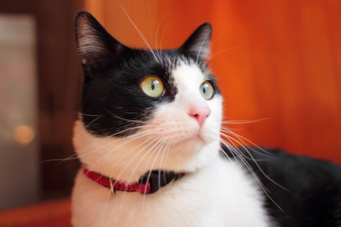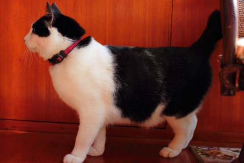 白黒で大きい雑種/短い鍵しっぽ/去勢済みのオス/赤い首輪