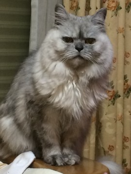 チンチラとアメリカンショートのミックス。姿は、チンチラ。オス、くびわなし。色、グレー、毛は長い。