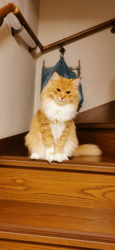 色が薄めの茶トラ。首元からお腹にかけての毛色は白く長毛でフサフサ、尻尾の太い猫です。