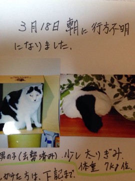 白黒の雑種オス猫で体重は7キロです。去勢済で、首輪はつけていません。臆病な性格で、声は高いです。室内飼いでしたが、一昨日、誤って家から出てしまい、大変心配しています。