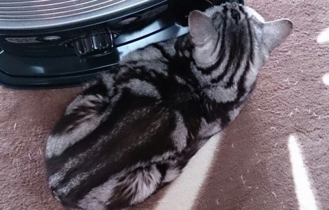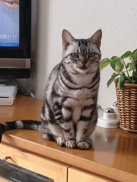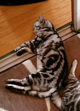 アメショーのグレーに黒の模様のシルバータビーです。