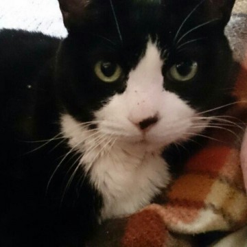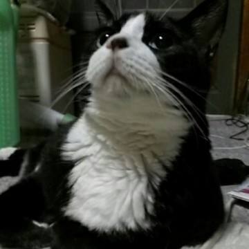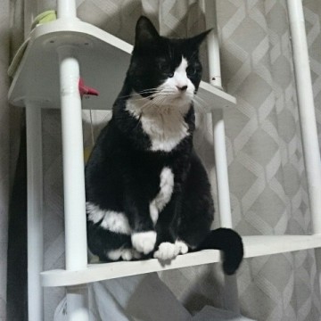 タクシードを着ているような模様、鼻の半分が黒い、靴下をはいているような足が特徴です