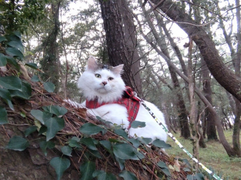 桜の花見ができる近くの山の公園にハーネスとリードを付けて連れて行った際、一緒に連れて行った三毛猫とハーネスを抜けて逃げてしまいました。この2匹を探しています。ご協力、よろしくお願いします。