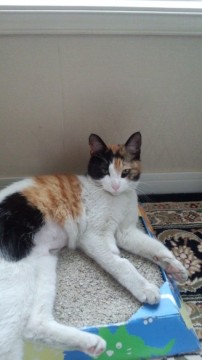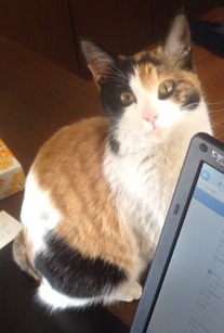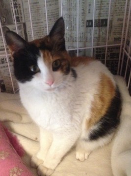 特徴:三毛猫 顔の半分が黒色 短いしっぽ