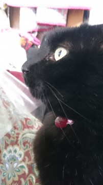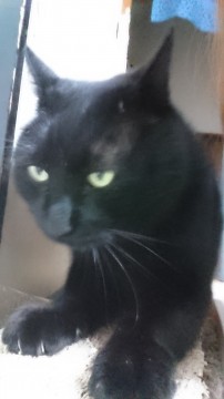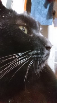 大きい黒猫です。下腹が白く、左の牙が折れている。ピンクの首輪を付けています。たまに無くすので、付いていないかもしれません。