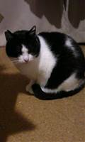 骨太でふっくらしています。白黒ブチの牛柄です。去勢済みの耳カットされています。