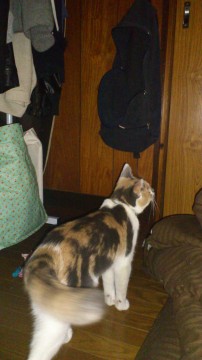 黄色い瞳をしています。尻尾は細く長さは普通です。