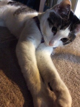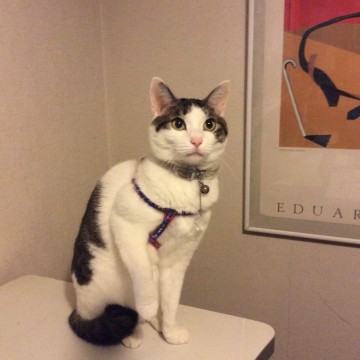 白黒のブチ、透明色首輪に青金の鈴、青いハーネス着けてます。