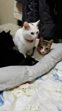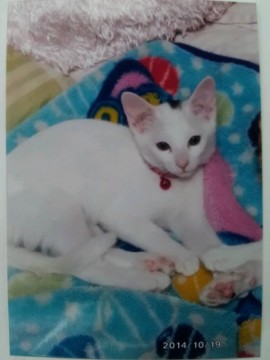 全体が白く、頭に黒い線があります。赤い鈴付きの首輪をしております。甘えるタイプのネコです。