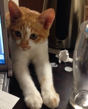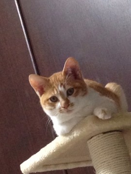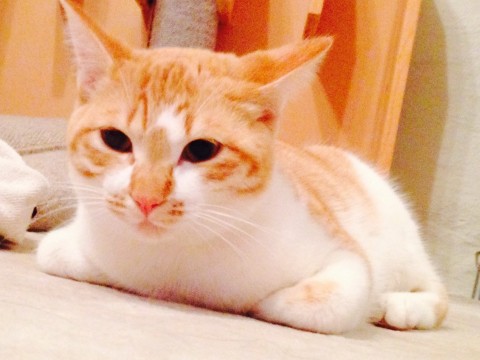 明るい茶色のトラネコでしっぽが短く不自然な鍵爪の様な形をしています。