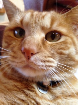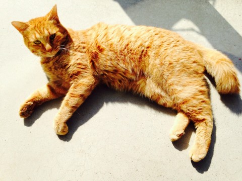 茶トラしっぽが太く先端は、茶と白のストライプで鍵しっぽ
