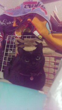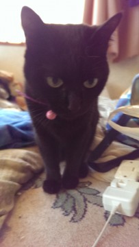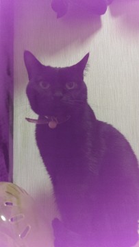 黒猫、尻尾は長くて、紫色の首輪とピンクの鈴をつけてます!