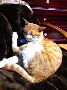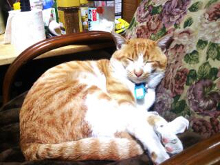 顎あたりからお腹は白、頭からしっぽまで明るい茶毛です。しっぽが少し太め。