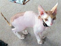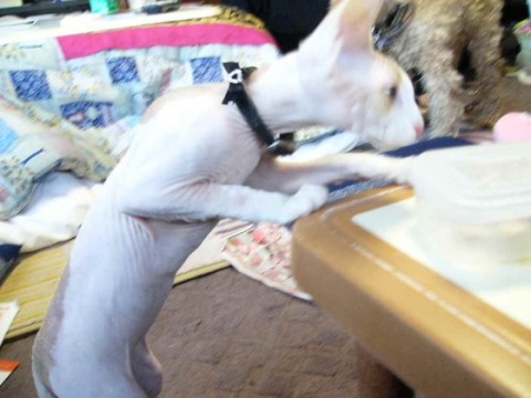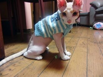 体に毛が生えていないスフィンクスという種類の猫のオス8か月です。去勢済で体重は3Kghほどです。ピンク色にみえる肌の色に赤茶の大きなドットです。