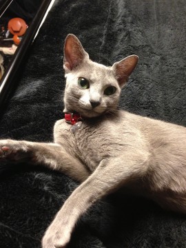 灰色のロシアブルーで黒の鈴付きの首輪をしています。