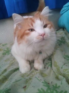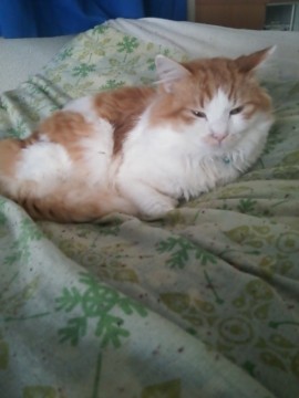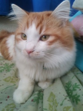 雑種のオス猫です。白と茶色の毛をしていて、背中にバリカンの跡があります。鳴き方に特徴があって、『二ャー』というより『カー』に近い鳴き声です。水色の首輪で鈴がついています。
