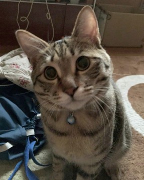 水色の首輪に水色の鈴が付いています。尻尾の先がカギしっぽになっています。1歳にしては大きめで下半身がポッチャリしています。