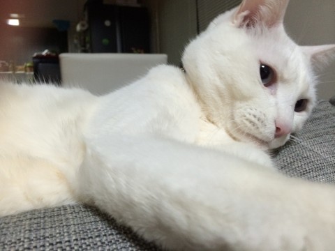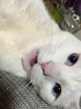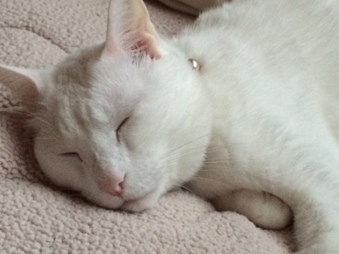 目はブルーで鈴のついた青い首輪をしています。かぎしっぽの真っ白な雄猫です。(去勢済み)