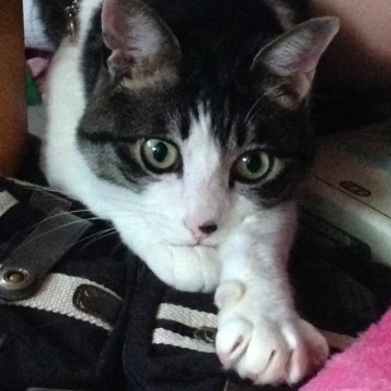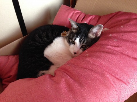 鼻の頭に黒い丸模様/八割れ/手足・腹が白い/尻尾の先が白い/ピンクの首輪(胴にも付ける8の字タイプ)/去勢済み