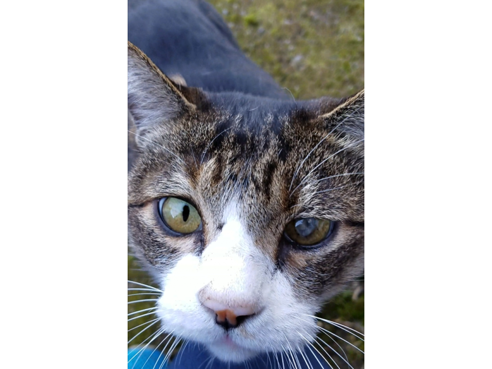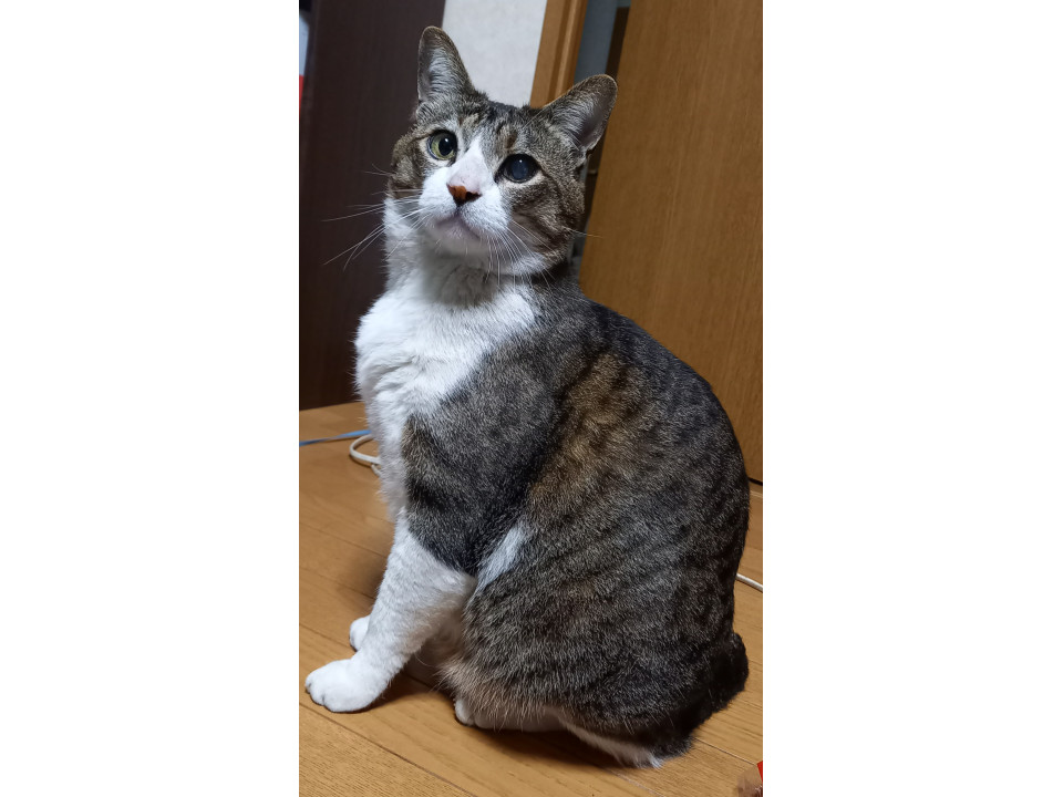 | 柄 | キジトラ(シロ)ハチワレ、背からの模様は腹で繋がっておらず腹中央は白。足は全て白。 | 首輪 | なし |