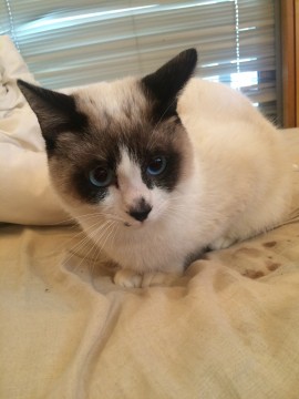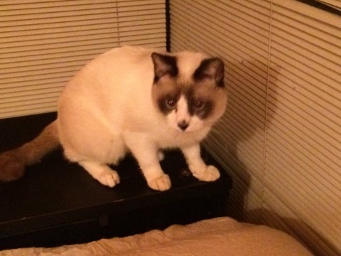 探してます。 色はシャム猫みたいな色で耳に色が入ってます。毛は中毛です。目はブルーです。