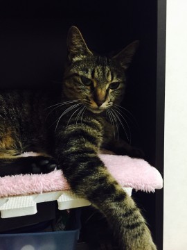 結構小柄で人懐っこい性格です。よく鳴く子です。目は黄土色か金か。避妊済みで、首輪なしです。肉球の色は黒で、キジトラです。