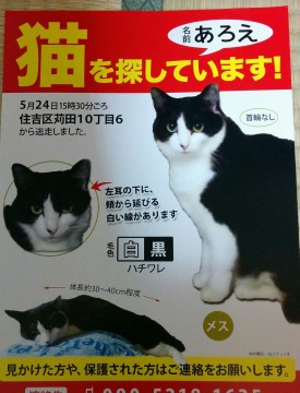 いまだ行方の分からない猫ちゃんが、一日も早く戻ってくることを願います。