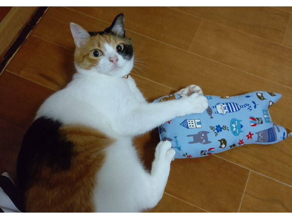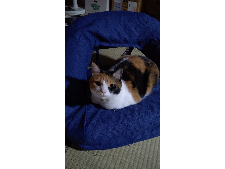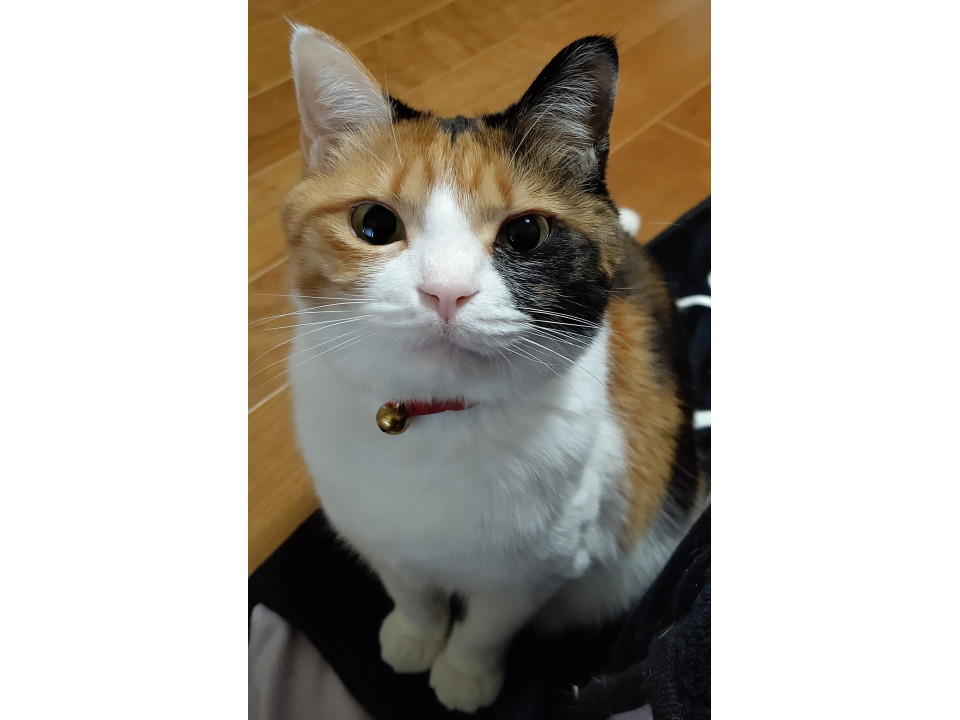 室内飼いの三毛猫でお腹は白いです。赤い鈴付きの首輪をしています。