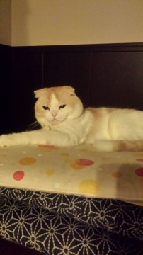 スコティッシュホールド 白薄茶模様 丸みのある顔 耳折れ 尻尾長い 青の首輪 性格臆病