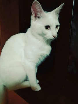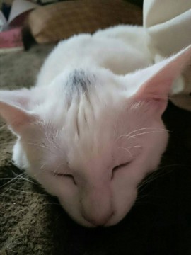 体は白く、頭に少し黒が入っています。首輪はつけていません。体型は標準くらいです。避妊済みです。