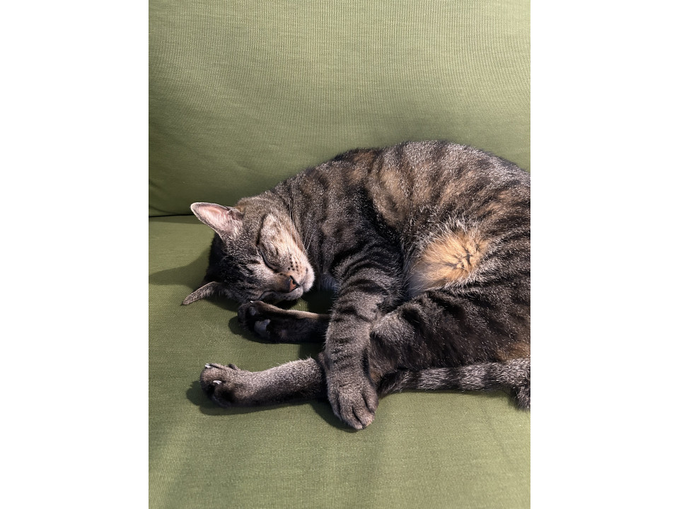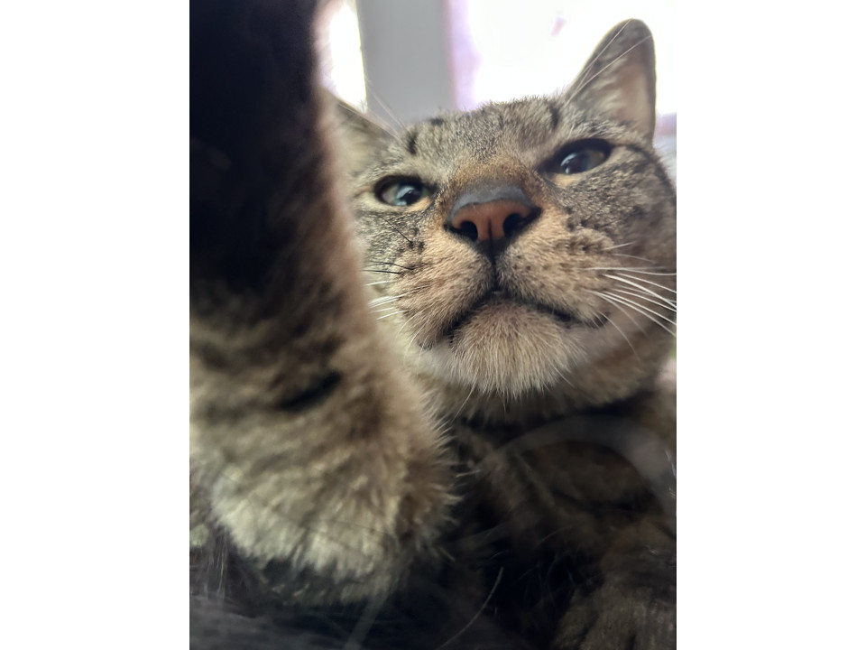 黒が多めのキジトラで、肉球は黒。口や鼻のまわりにアプリコット色の毛が混じっています。マズルや耳はすこしまるっこいかんじで、手脚は太めで全体も大柄です。