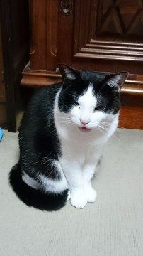 黒白猫、顔はハチワレ。