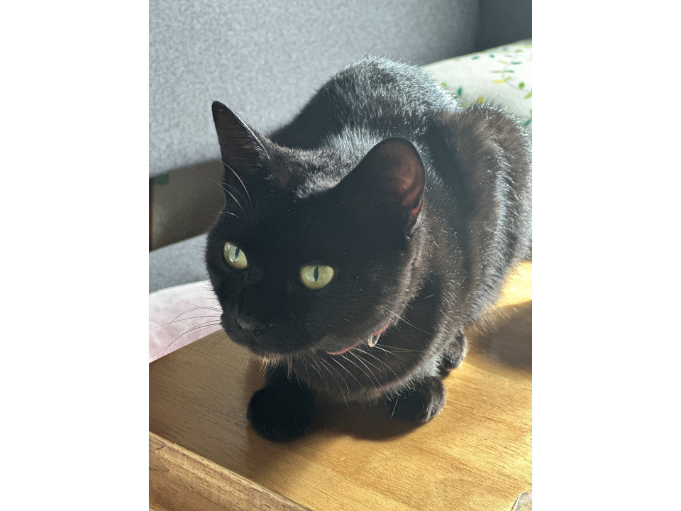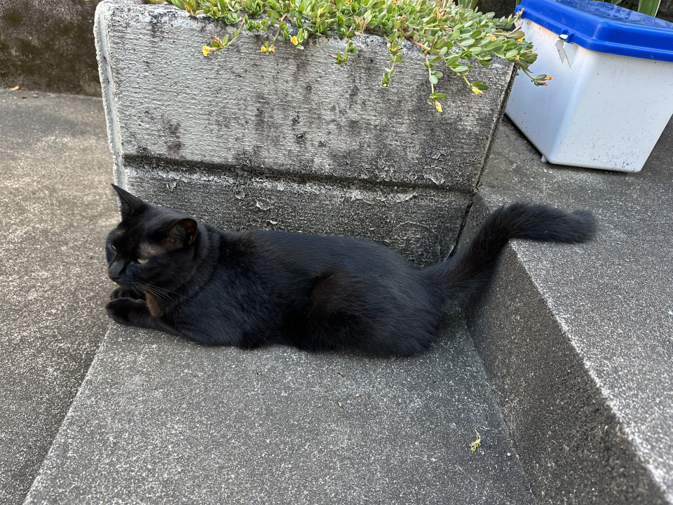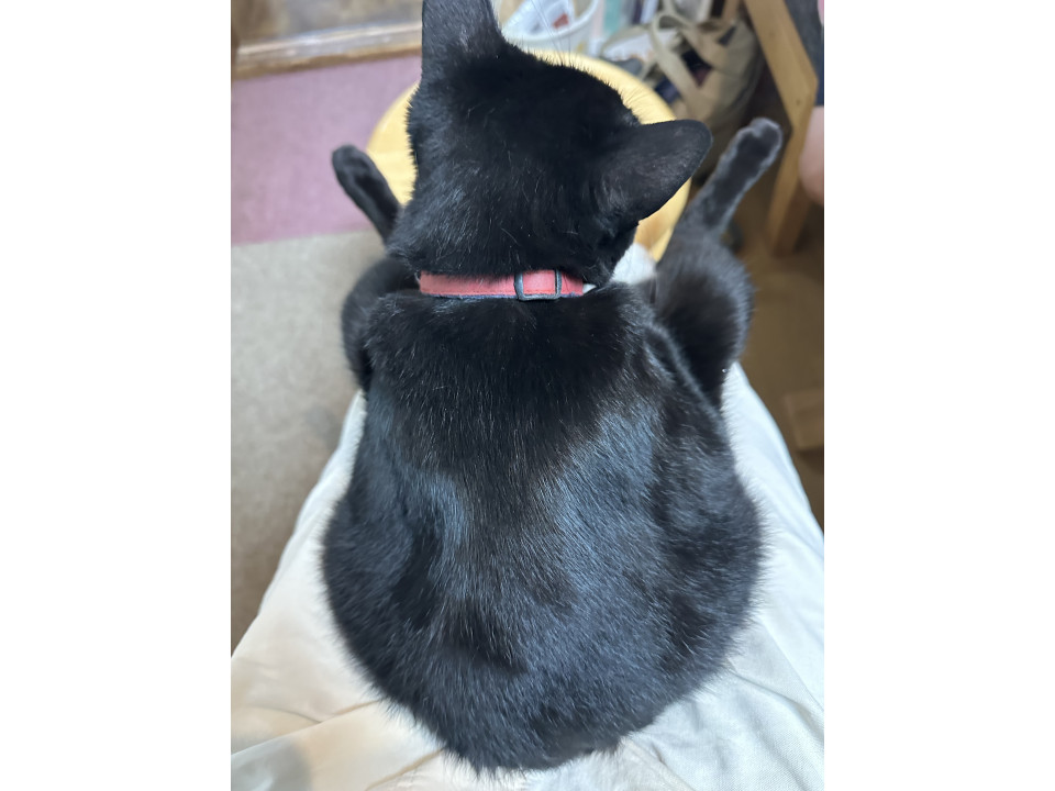 黒猫。肉球も全て黒いです。ですが外が好きなので肉球は白っぽくなってます。尻尾は長くて、赤い首輪しています。チュール好きです。
