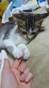 キジトラの子猫です。しっぽは長く、人なつっこく元気です。