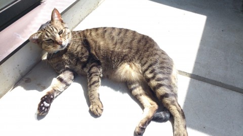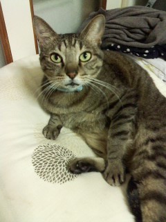オスのキジトラです。色は茶色で体にこげ茶色の縞模様があります。尾長、首輪なし、去勢済みです。とても人懐っこい猫です。