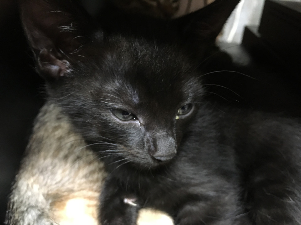 全身真っ黒です。しっぽは長めで真っ直ぐです。写真は子猫の頃のものですが、今は成猫です。