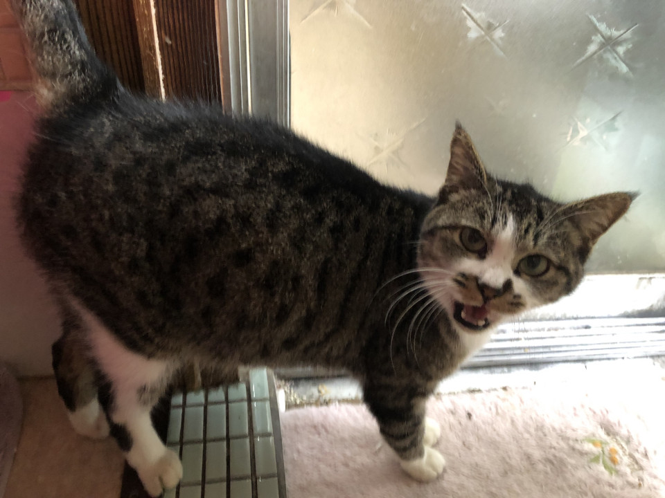 お腹が白いです。お口の周りが黒い模様入ってます。一見キツい目をしてるように見えますが