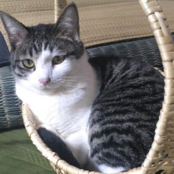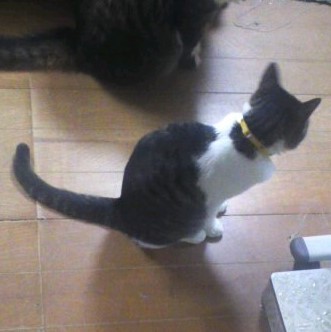 毛色は、白多めの黒キジ(頭部と背中から尻尾にかけてが黒キジで、手足と腹は白)なので、一見白黒に見えます。
